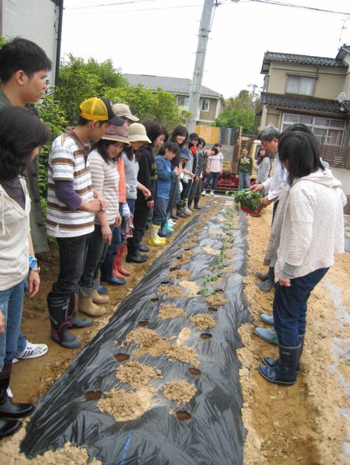 | サツマイモの苗を分けますよ〜。 どの穴に植えようかな・・。 |