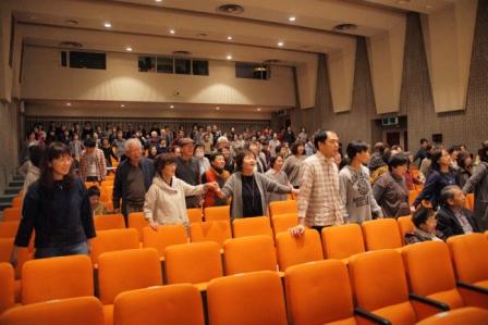 | 会場一体となって 手をつないで | 新井場さんと森永さんは遠い所、駆けつけてくれました |